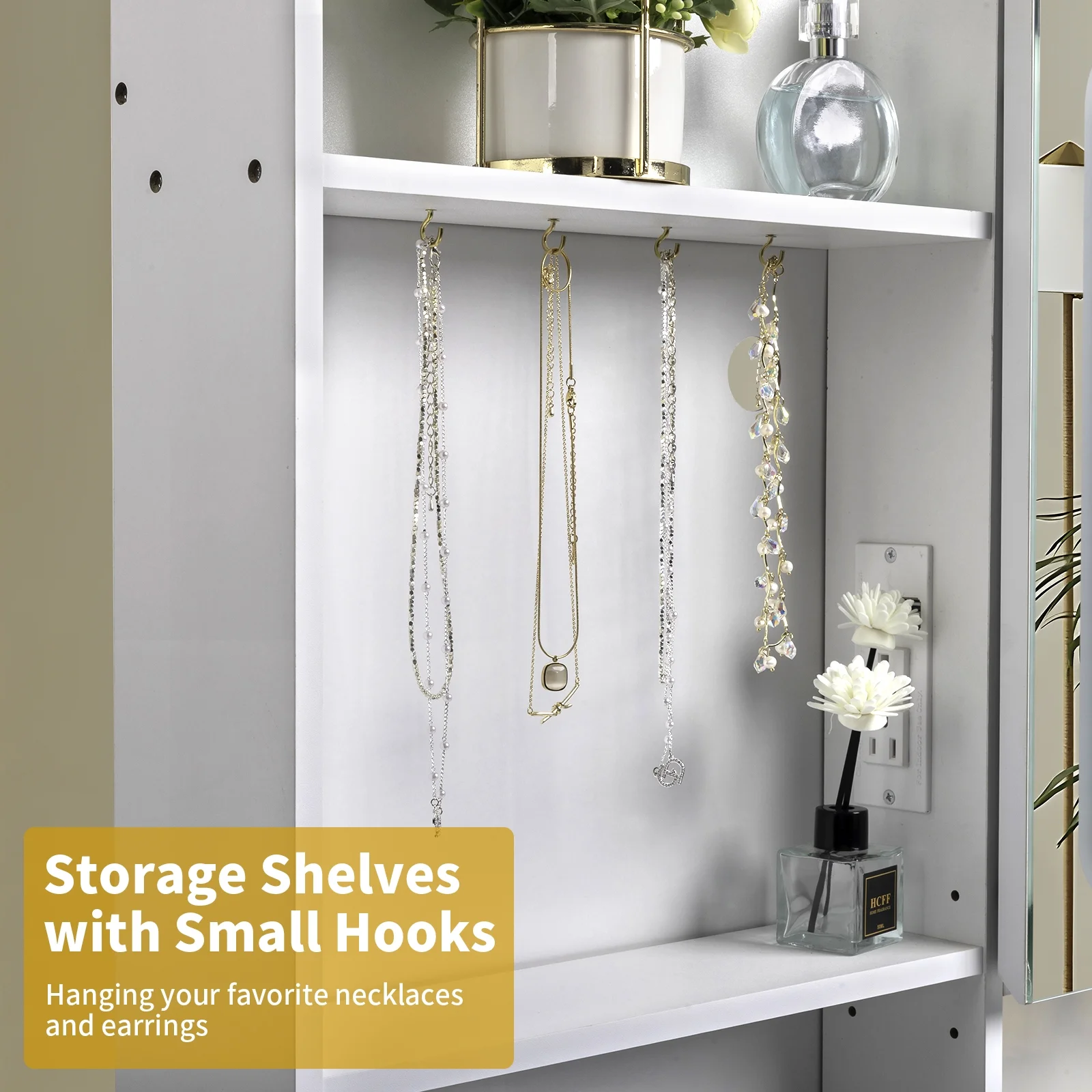 - The hooks on the storage shelf for hanging your necklaces and earrings