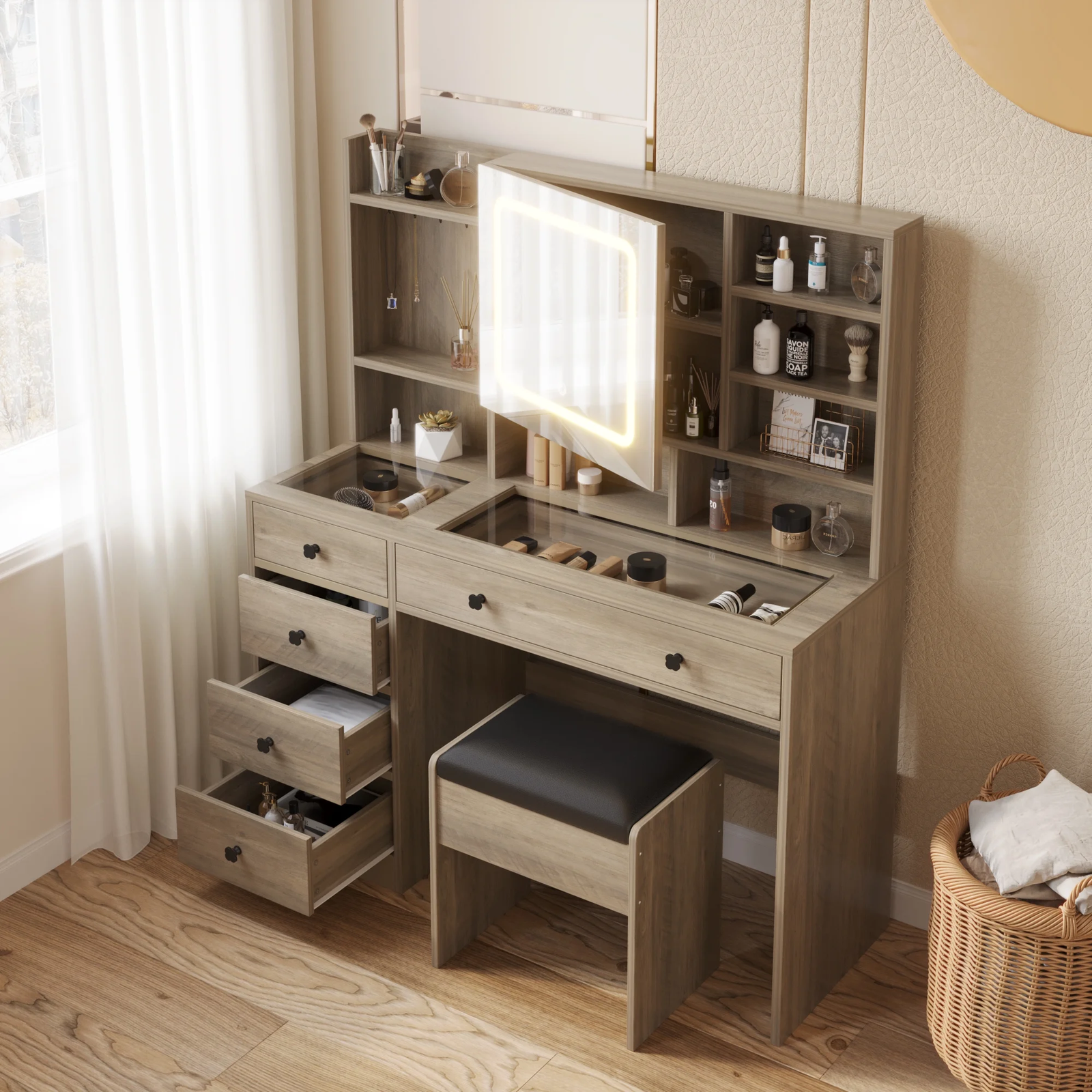 This vanity desk offers abundant storage space with its five big drawers. From cosmetics to accessories, you can neatly organize and store all your essentials, keeping your vanity area clutter-free and tidy. Say goodbye to the hassle of searching for your favorite products in the morning.