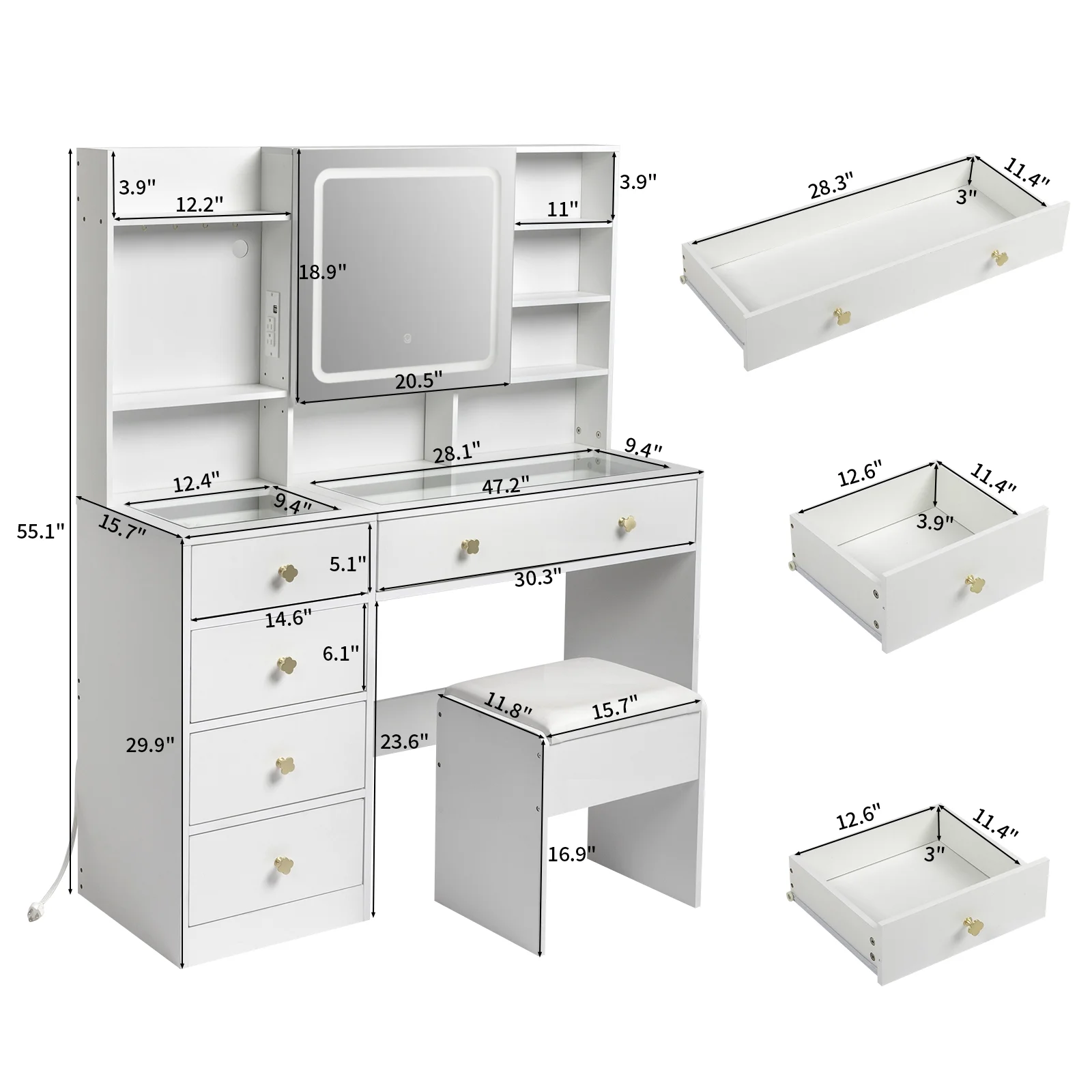 We understand the importance of staying connected in today’s digital world. That’s why our vanity desk comes with a built-in charging station. You can conveniently charge your phone, tablet, or other electronic devices while getting ready, eliminating the need for multiple power outlets or messy cables. - Ample Storage – 5 Big Drawers: