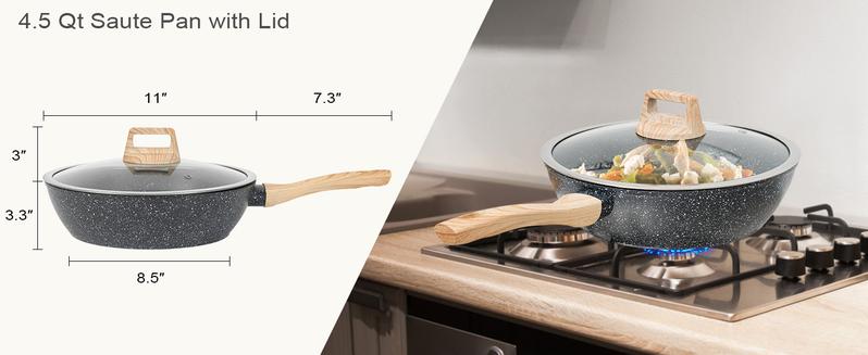 • Versatile Cooking Set: SODAY 12 pcs kitchen cookware set includes 9 inch/11 inch frying pans, 11 inch/4.5QT saute pan with lid,4.3 QT saucepan with lid and steamer,1.5 QT saucepan with lid and silicone shovel spoon & tongs ideal for your daily cooking
